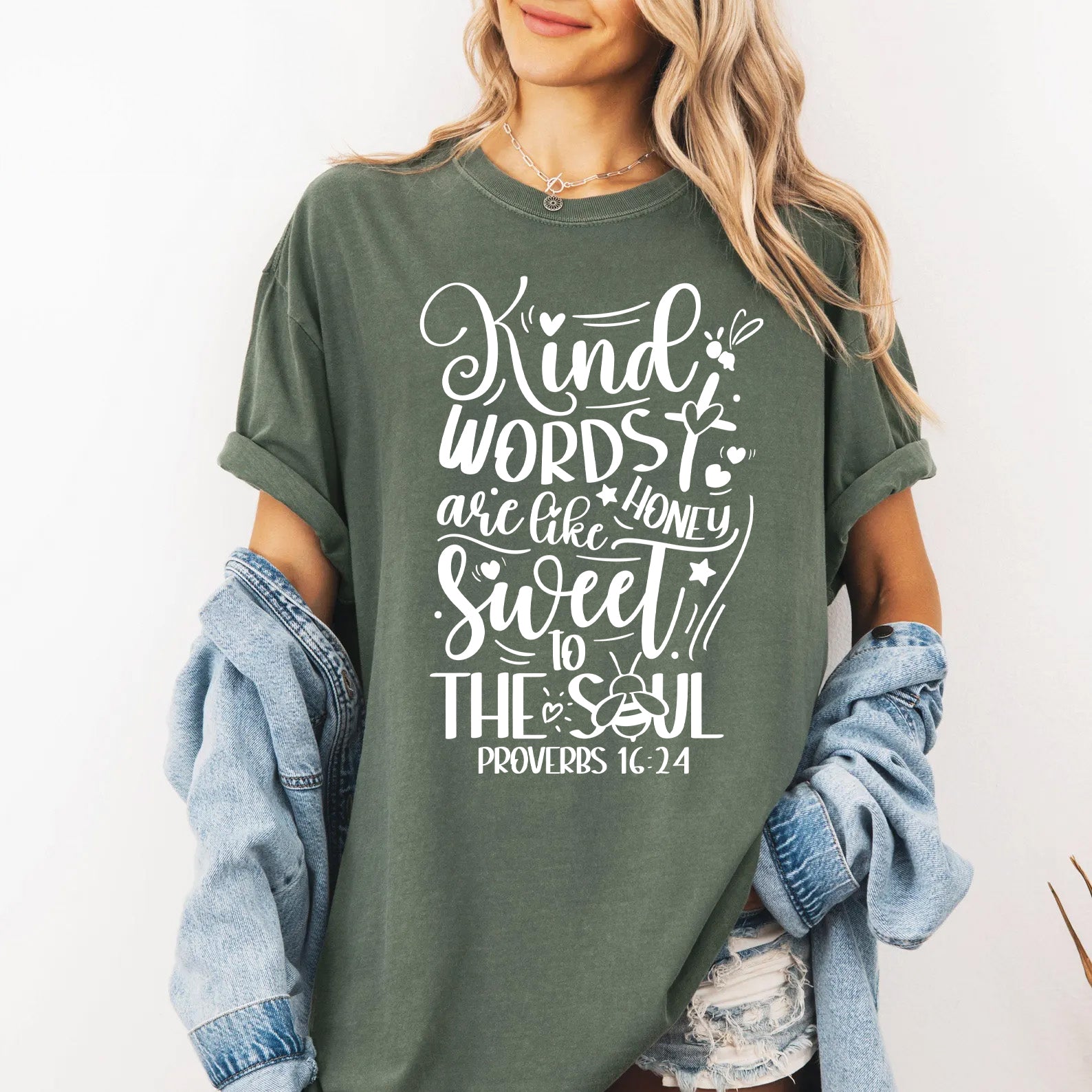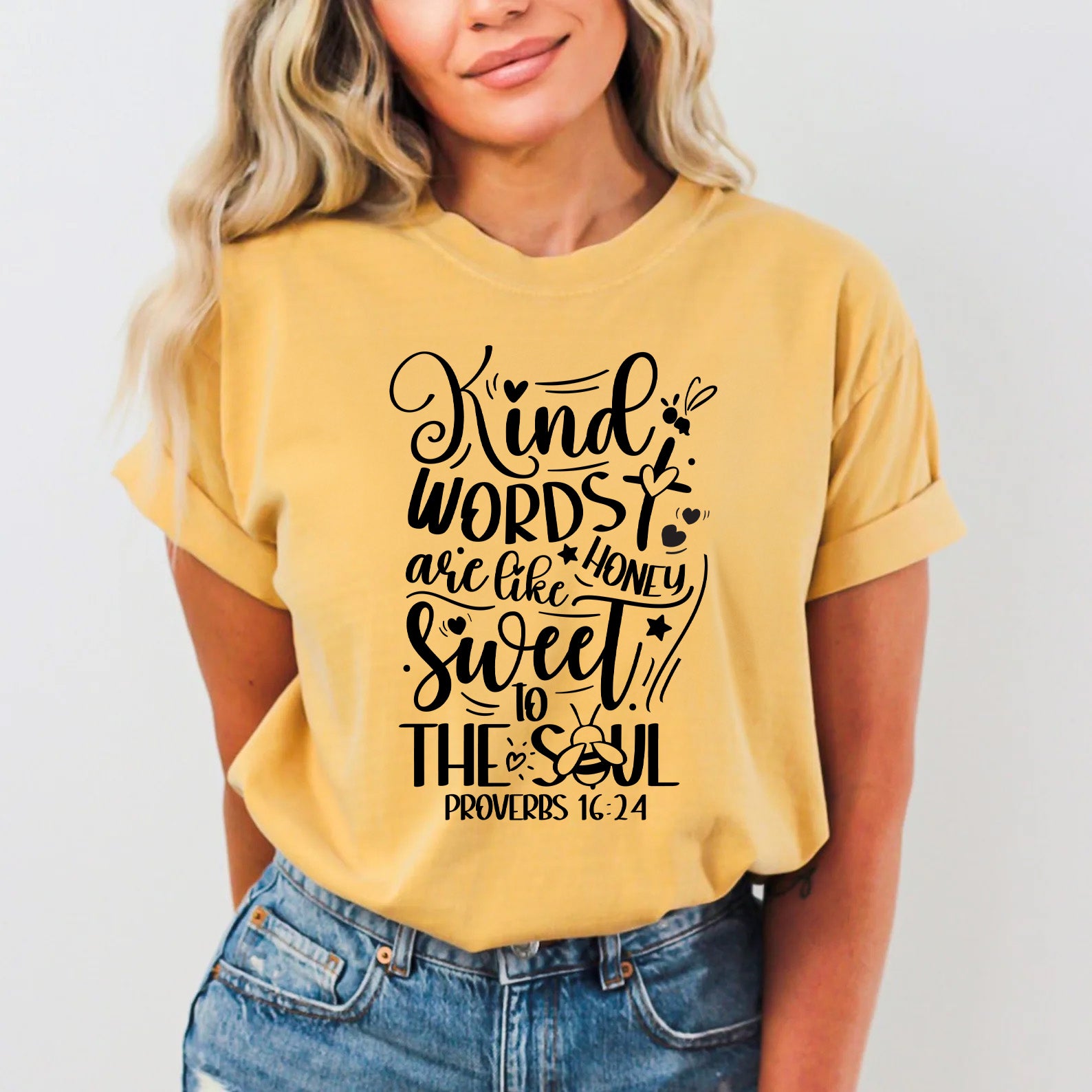 Let your wardrobe speak life with our Kind Words Honey T-Shirt, inspired by the beautiful truth of Proverbs 16:24: