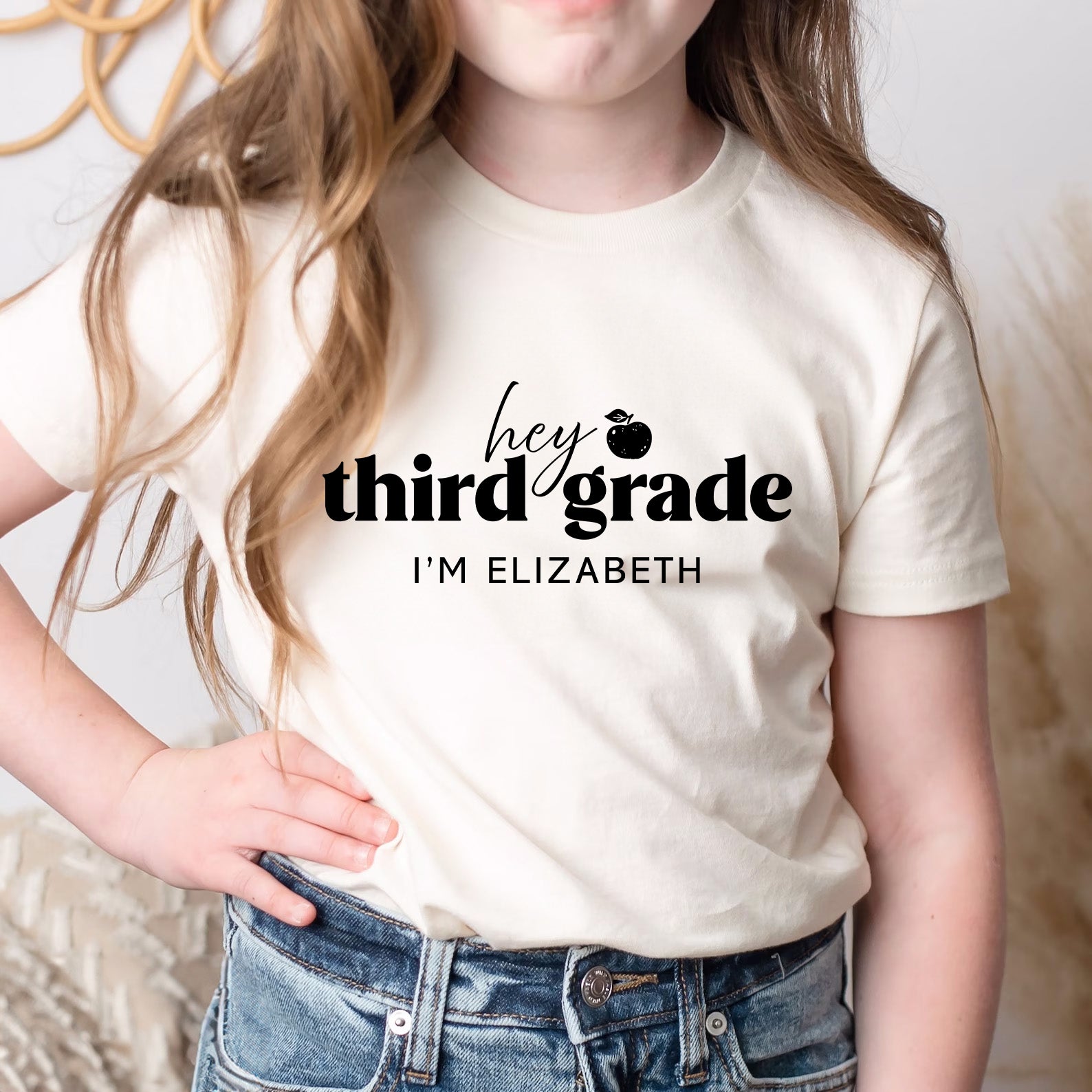 Start the school year in style with this adorable "Hey Third Grade" shirt — complete with your child’s name for a personal touch! Perfect for first-day photos, classroom introductions, and making your little one feel extra special on their big day. This custom tee is a sweet and stylish way to kick off the third grade adventure!